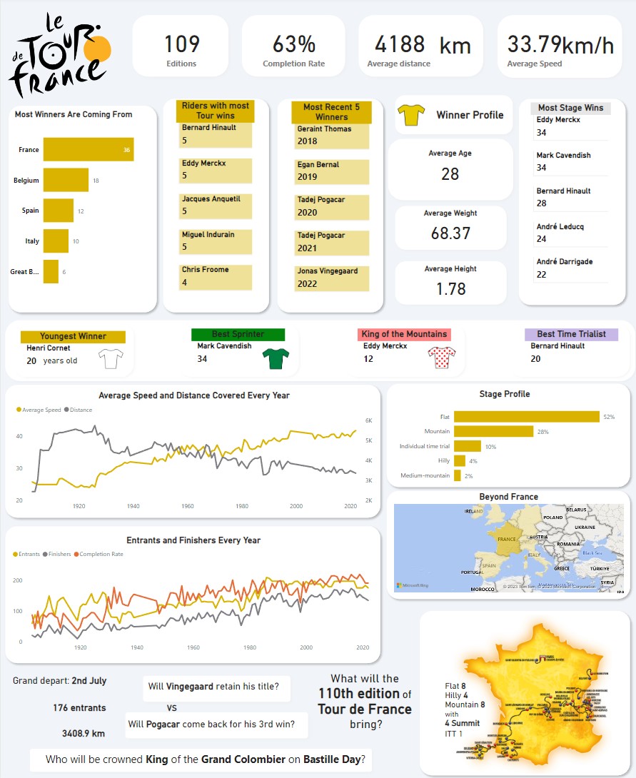 In this project I explored the world of Tour de France. Through data analysis, and storytelling I celebrated the extraordinary achievements and paid tribute to the enduring legacy of this iconic event.