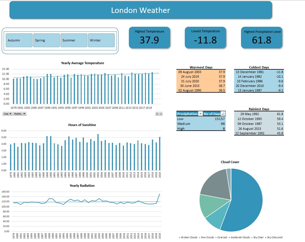 In this project, I analysed London Weather from 1979 to 2020. The focus was on analysing and detecting any noticeable changes in the weather conditions during this period.